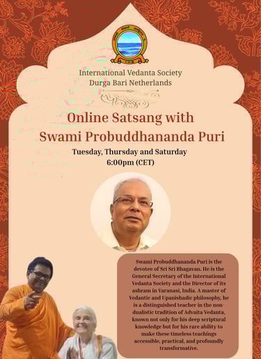 Anyone interested is welcome to join the online satsangs that Swami Probuddhananda offers at the Durga Bari ashram of Tulsi Mata. They are held in English with Dutch translation. If you are new, please contact Ilse Aperloo before attending for the first time. Phonenumber: +31-6-34339319